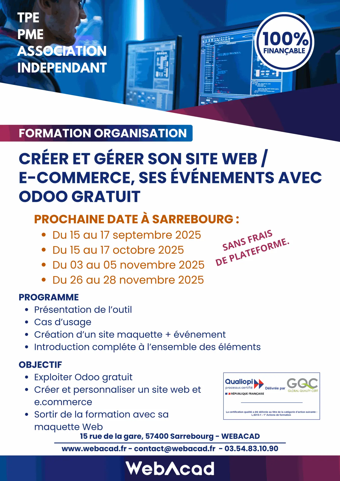 CRÉEZ, STRUCTUREZ, DÉCOLLEZ : EXPLOITEZ ODOO GRATUIT POUR BOOSTER VOTRE ORGANISATION Vous êtes indépendant, dirigeant d'une TPE ou bénévole en association, et vous cherchez des solutions concrètes pour optimiser votre gestion ? Avec Odoo Gratuit, c'est un univers d'efficacité et de simplicité à votre portée. 🎯